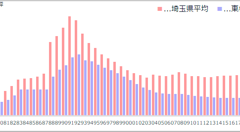 後悔しない土地売買の方法今回は、昨今の地価動向について、東松山市を中心に考えてみます。まず、東松山市の公示地価平均データが以下の青部分になります。 東松山市は、おおよそ平成に入ってから一貫して低下し続けています。 最高潮の数字が以下。 平成3年...